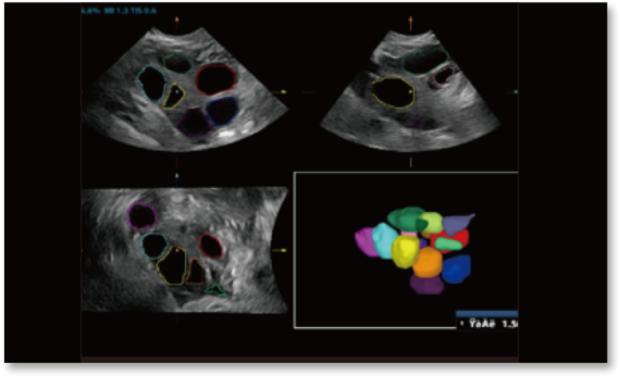 Smart FLC secara otomatis mendeteksi jumlah folikel dann menghitung setiap volume dari gambar volume ovarium 3D, memastikan penilaian folikel yang akurat, penting untuk pemeriksaan IVF.