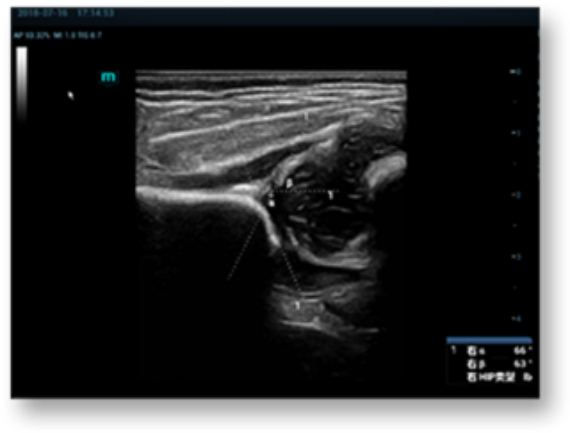 Metode yang paling umum digunakan untuk evaluasi pinggul, hasilnya sesuai dengan klasifikasi pinggul yang jelas. Deteksi struktur kunci didasarkan pada algoritma pembelajaran mendalam. Pengukuran otomatis (α dan ) dan klasifikasi.